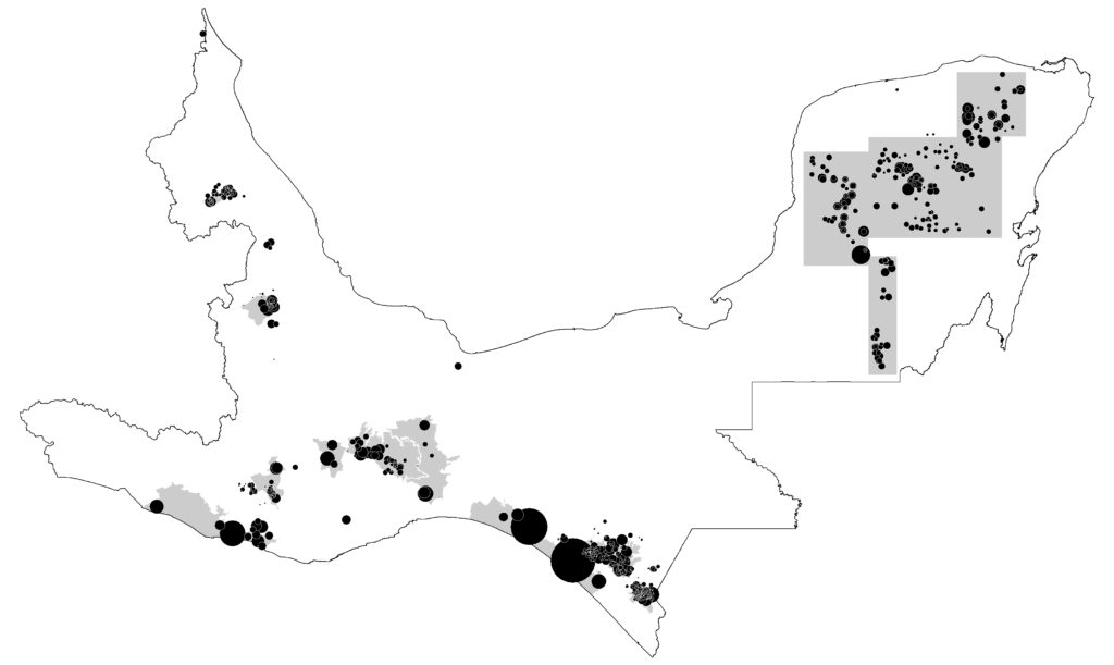 El SIMMIP más que un sistema técnico, es una apuesta por la gestión sostenible y participativa de los paisajes. A continuación puedes ver las localidades en las que Heifer participa con sus productores/participantes y en gris los límites de los 11 paisajes de primer nivel y 20 de sgundo nivel.